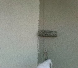 外壁の仕上げになります上塗りです。元が石目調という事もあり、吸い込みが激しい為、下、中、上塗りとたっぷり塗布していきました。
