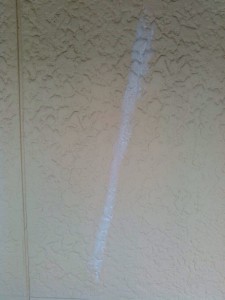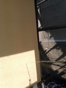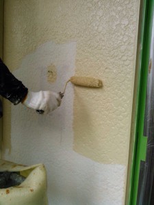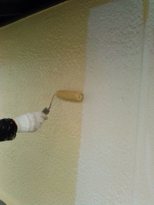白くなっている外壁部分が下塗りで、写真は中塗りの作業中の写真になります。明るく見えて、とても美しい色ですね。