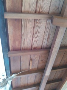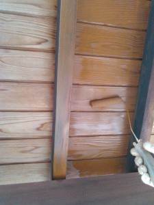 軒天の塗装です。木材保護塗料で塗っていきます。使用塗料は、ガードラックプロになります。