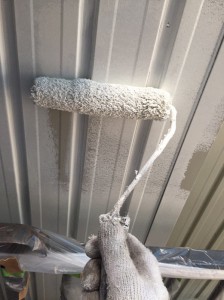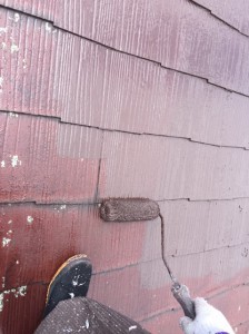 屋根、下塗り後の中塗りになります。屋根の痛みが激しい為、プライマーは2回塗布しました。その後の中塗りになります。
