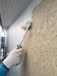 外壁の下塗りになります。使用塗料は、関西ペイントのダイナミックフィラーになります。湿度にも強く、日本の気候に適している塗料となります。