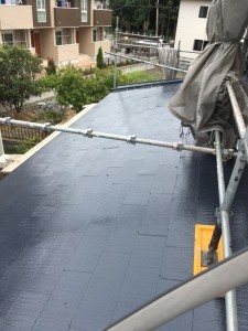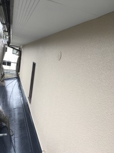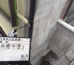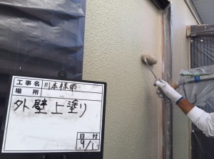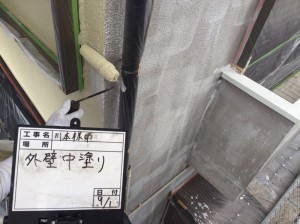 外壁中塗りになります。使用塗料は、SK化研プレミアムシリコンで、期待耐用年数は10年~15年になります。フッ素に近い高耐高な塗料になります。