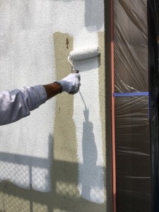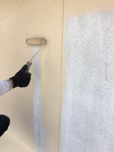 外壁の下塗りになります。外壁はクラック(ひび割れ)が目立っていました。ひび割れを埋めていく必要がある為、微弾性フィラーという下塗り材を塗布しました。