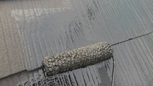 屋根の上塗りになります。艶が出るよう、たっぷりと塗布していきます。