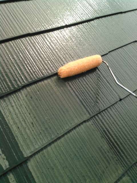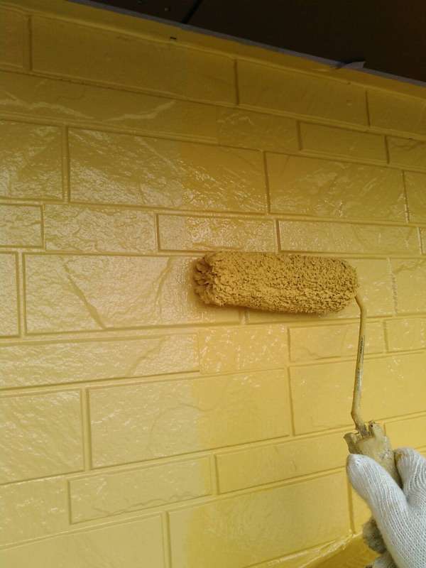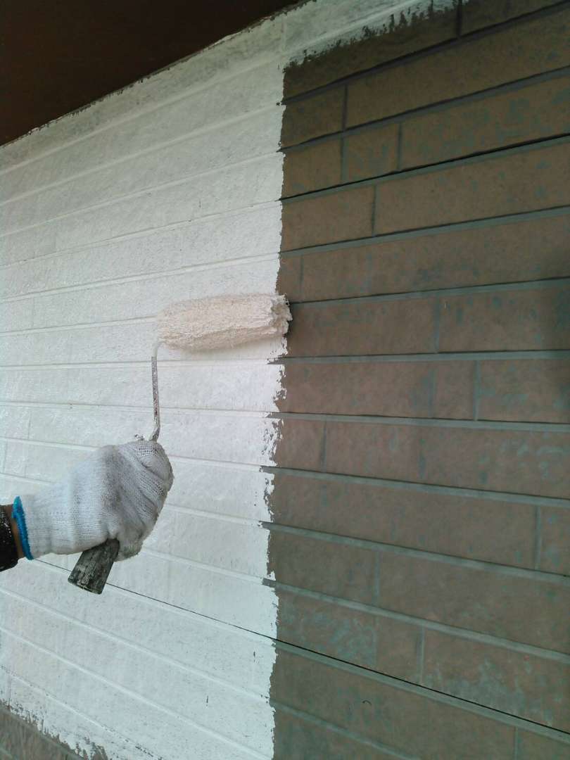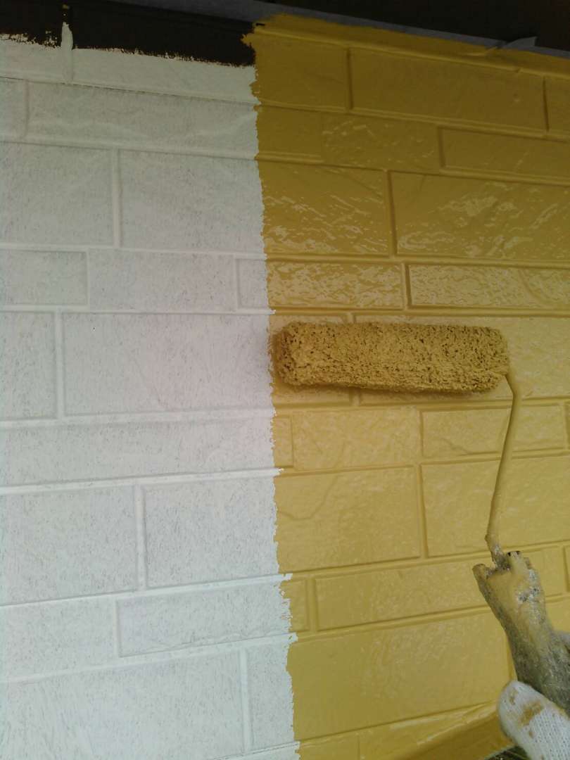 外壁の上塗りになります。 たっぷり丁寧に塗布していきます。